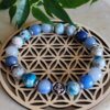 Bracelet en pierres boules 10 mm en Jaspe K2 et aventurine bleue avec intercalaires et fleur de lys argentés.